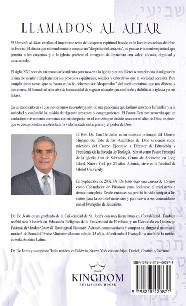 El Llamado al Altar, explora el importante tema del despertar espiritual basado en la lectura cautelosa del libro de Esdras. El afirma que el mundo entero necesita un "despertar del corazón", un gran avivamiento espiritual que permita a los creyentes y a la iglesia predicar el evangelio de Jesucristo con valor, eficacia, dignidad y misericordia. El siglo XXI necesita un nuevo avivamiento para mover a la iglesia y a sus líderes a cumplir con la asignación divina de alentar e implementar los procesos espirituales, sociales y educativos que la sociedad necesita. Para cumplir estas metas, que se basan en la fe, debemos ser "despertados" del sueño espiritual que nos detiene y desorienta. El llamado al altar aborda la necesidad de superar el sueño que confunde y debilita a la iglesia y a sus líderes. En un momento en el que nos estamos reconstruyendo de una pandemia que lastimó mucho a la familia y a la sociedad y confundió la misión de algunos creyentes y congregaciones. El Pastor Dan nos recuerda que un verdadero avivamiento comienza con un despertar en el corazón que decide restaurar el altar de Dios; es decir, que se comprometa a reestructurar la vida fundada en la gracia y el poder de Dios.
