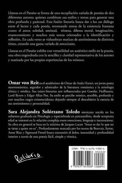 Llamas en el Paraíso se forma de una recopilación variada de poesías de dos diferentes autores; quienes combinan sus estilos y temas para generar una obra profunda y pasional. Esta fusión literaria busca dar a luz un diálogo entre el lector y cada poesía, retomando temas de la existencia humana como: el amor, soledad, amistad, tristeza, dilema moral, imaginación, enamoramiento y muchos más temas orientados a la identificación y reflexión. En cada verso se vislumbran matices de sentimientos de distintos tintes, creando una gama variada de emociones. Llamas en el Paraíso exhibe con versatilidad un auténtico estilo en la poesía, una obra engendrada con la sencillez y claridad representativa de los autores y matizada por las propias experiencias de los mismos.