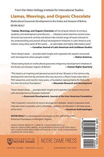 Bolivia, like most developing countries around the world, strove for decades to imitate Western and particularly U.S. methods of development, importing the latest technologies, institutions, crops, and livestock. Finally, beginning in the 1970s, faced with many striking instances of failure in the application of the North American modernization paradigm, diverse sectors of Bolivian civil society turned inward to rediscover their country's own multicultural identities and agrarian wisdom as sources of strength upon which to build their own socioeconomic development. The shift spawned a proliferation of development projects grounded in a new "indigenization" or revitalization of cultural traditions. Llamas, Weavings, and Organic Chocolate: Multicultural Grassroots Development in the Andes and Amazon of Bolivia is the story of Bolivian rural development and cultural change. Part I provides an overview of the history of rural development in Bolivia-the long history of anti-indigenous discrimination, the introduction of aid programs in the Western development paradigm, the rise of grassroots movements challenging this paradigm, and the array of initiatives now contributing to the revitalization of indigenous cultural resources. Part II consists of in-depth narratives of nine projects, giving an inside view of the processes that interweave cultural recuperation and developmental strategies. These stories illustrate the cultural barriers that must be overcome and the setbacks often faced by grassroots federations. The projects range from successful agro-exports such as organic chocolate and quinoa to the groundbreaking work of indigenous artists and artisans. In Part III, author Kevin Healy attempts to identify the numerous factors that helped engender successful outcomes in these projects and discusses the effects of globalization on Bolivian culture and development patterns. This inspirational story of social change led by idealism will be valuable for international policymakers, analysts, and aid officials, as well as native North and South Americans, and non-Native Americans who strongly identify with their struggles.