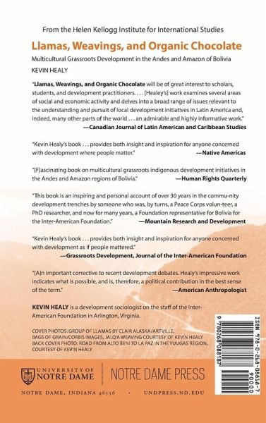 Bolivia, like most developing countries around the world, strove for decades to imitate Western and particularly U.S. methods of development, importing the latest technologies, institutions, crops, and livestock. Finally, beginning in the 1970s, faced with many striking instances of failure in the application of the North American modernization paradigm, diverse sectors of Bolivian civil society turned inward to rediscover their country's own multicultural identities and agrarian wisdom as sources of strength upon which to build their own socioeconomic development. The shift spawned a proliferation of development projects grounded in a new "indigenization" or revitalization of cultural traditions. Llamas, Weavings, and Organic Chocolate: Multicultural Grassroots Development in the Andes and Amazon of Bolivia is the story of Bolivian rural development and cultural change. Part I provides an overview of the history of rural development in Bolivia-the long history of anti-indigenous discrimination, the introduction of aid programs in the Western development paradigm, the rise of grassroots movements challenging this paradigm, and the array of initiatives now contributing to the revitalization of indigenous cultural resources. Part II consists of in-depth narratives of nine projects, giving an inside view of the processes that interweave cultural recuperation and developmental strategies. These stories illustrate the cultural barriers that must be overcome and the setbacks often faced by grassroots federations. The projects range from successful agro-exports such as organic chocolate and quinoa to the groundbreaking work of indigenous artists and artisans. In Part III, author Kevin Healy attempts to identify the numerous factors that helped engender successful outcomes in these projects and discusses the effects of globalization on Bolivian culture and development patterns. This inspirational story of social change led by idealism will be valuable for international policymakers, analysts, and aid officials, as well as native North and South Americans, and non-Native Americans who strongly identify with their struggles.