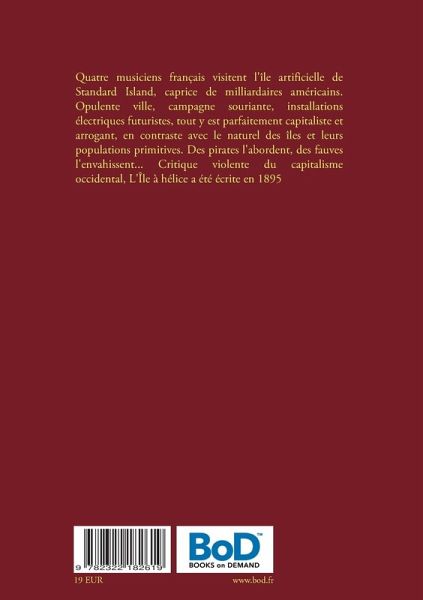 Quatre musiciens français visitent l'île artificielle de Standard Island, caprice de milliardaires américains. Opulente ville, campagne souriante, installations électriques futuristes, tout y est parfaitement capitaliste et arrogant, en contraste avec le naturel des îles et leurs populations primitives. Des pirates l'abordent, des fauves l'envahissent... Critique violente du capitalisme occidental, L'Île à hélice a été écrite en 1895