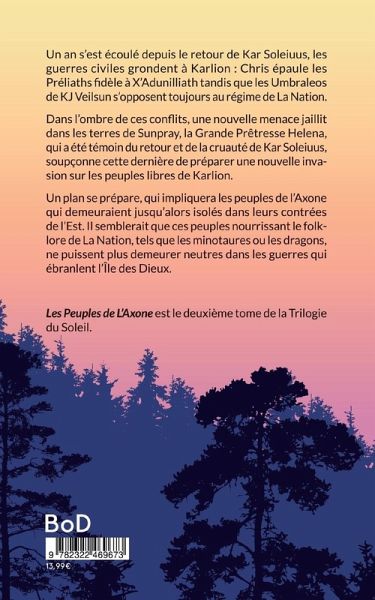 Un an s'est écoulé depuis le retour de Kar Soleiuus, les guerres civiles grondent à Karlion: Chris épaule les Préliaths fidèle à X'Adunilliath tandis que les Umbraleos de KJ Veilsun s'opposent toujours au régime de La Nation. Dans l'ombre de ces conflits, une nouvelle menace jaillit dans les terres de Sunpray, la Grande Prêtresse Helena, qui a été témoin du retour et de la cruauté de Kar Soleiuus, soupçonne cette dernière de préparer une nouvelle invasion sur les peuples libres de Karlion. Un plan se prépare, qui impliquera les peuples de l'Axone qui demeuraient jusqu'alors isolés dans leurs contrées de l'Est. Il semblerait que ces peuples nourrissant le folklore de La Nation, tels que les minotaures ou les dragons, ne puissent plus demeurer neutres dans les guerres qui ébranlent l'Île des Dieux.Les Peuples de l'Axone est le deuxième tome de la Trilogie du Soleil.
