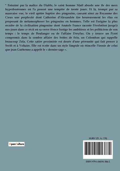 " Entraîné par la malice du Diable, le saint homme Maël aborde une île des mers hyperboréennes où l'a poussé une tempête de trente jours. Et là, trompé par sa mauvaise vue, le vieil apôtre baptise des pingouins, causant ainsi au Royaume des Cieux une perplexité dont Catherine d'Alexandrie tire heureusement les élus en proposant de métamorphoser les pingouins en hommes. Telle est l'origine la plus reculée de la civilisation pingouine dont Anatole France raconte l'évolution jusqu'à nos jours dans ce récit où sa verve féroce fustige les ambitieux et les politiciens de son temps : le temps de Boulanger ou de l'affaire Dreyfus. On y trouve un Pyrot compromis dans la sombre affaire des bottes de foin, un Colomban qui rappelle beaucoup Zola. Cette satire pessimiste est douée d'une pérennité qui fait penser à Swift et à Voltaire. Elle est écrite dans un style limpide où étincelle l'ironie de celui que jean Guéhenno a appelé le « dernier sage ».