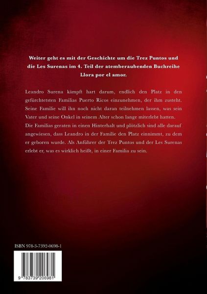 Weiter geht es mit der Geschichte um die Trez Puntos und die Les Surenas im 4. Teil der atemberaubenden Buchreihe Llora por el amor.Leandro Surena kämpft hart darum, endlich den Platz in den gefürchtetsten Familias Puerto Ricos einzunehmen, der ihm zusteht. Seine Familie will ihn noch nicht daran teilnehmen lassen, was sein Vater und seine Onkel in seinem Alter schon lange miterlebt hatten. Die Familias geraten in einen Hinterhalt und plötzlich sind alle darauf angewiesen, dass Leandro in der Familie den Platz einnimmt, zu dem er geboren wurde. Als Anführer der Trez Puntos und der Les Surenas erlebt er, was es wirklich heißt, in einer Familia zu sein.