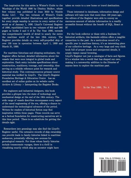 Everything there is to know about the maritime world of 1890 in a single, huge, two-volume edition. Extractive summary (three most statistically significant sentences): This Book contains the Names, Classes, and detailed information concerning the Vessels classed by Lloyd's Register and the late Underwriters' Registry for Iron Vessels; and in addition the Names, Dimensions, and other particulars of all Vessels of 100 tons and upwards registered in the United Kingdom, and of many ships of large tonnage owned abroad. UNIVERSAL REGISTER, issued annually on the 1st of April. The book contains, in addition to the Names, Classes, and other useful information relating to Yachts classed by the Society, the Names, Dimensions, &c., of all British and Foreign Yachts, the particulars of which are known; also, in an Appendix, a List of the various Yacht Clubs and Illstrations of their respective Flags, an Illustrated List of the Racing Flags of Yachts, an Index of Signal Letters, a List of Yachts the names of which have been changed, a List of Yachts arranged according to Tonnage, an Alphabetical List of the Names and Addresses of Yacht Owners so far as they can be ascertained, and a List of Yacht Builders and Designers showing the Yachts which they have respectively built and designed, besides Statistical and other interesting information. From the Publisher's Note: For maritime historians and shipping enthusiasts, the Register offers factual, detailed information about the vessels that were once integral to global trade and exploration. Each entry includes specifications about construction, machinery, tonnage, and ownership, thus serving as a reliable reference point for research and historical study. This contemporaneous primary source material was verified by Lloyd's. The Lloyd's Register Foundation Heritage & Education Centre has an excellent set of online guides to using these documents on its website under Archive & Library > Interpreting the Register Books.For engineers and industrial designers, this book provides a glimpse into the state of technology and mechanical design at the end of the 19th century. The wide range of vessels describes encompasses every aspect of the naval engineering of the era, offering a chance to understand the technological advances of the period.Writers for readers of historical fiction may find inspiration within these pages. These records can serve as a factual foundation for constructing narratives set in this time period. There is no substitute for getting the details right.* Students of genealogy may find the ship descriptions illuminate their ancestors' voyages.For the book collector or those with a fondness for historical artifacts, this facsimile edition offers a tangible connection to the past. As a meticulous record of a specific year in maritime history, it's an interesting piece of our collective heritage. As a very large and very thick book full of proper nouns and unexpected details, it amply repays casual browsing.Lloyd's Register not just a catalogue of facts and figures. It's a window into a world that has shaped our own, making it a noteworthy addition to the libraries of anyone keen to explore the maritime past. *It goes without saying that time travelers will find this a crucial tool for planning and coordinating trips into the Victorian Era.