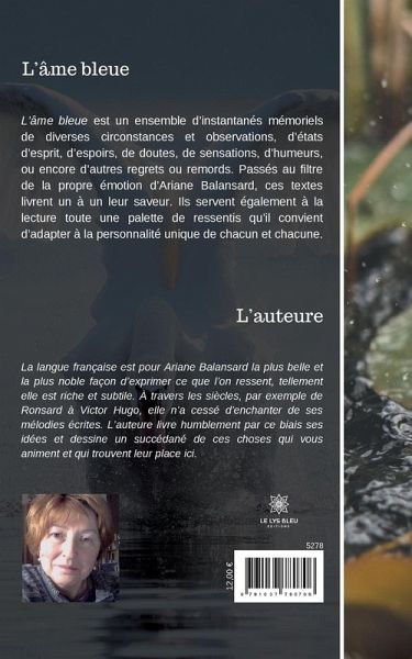 L¿âme bleue est un ensemble d¿instantanés mémoriels de diverses circonstances et observations, d¿états d¿esprit, d¿espoirs, de doutes, de sensations, d¿humeurs, ou encore d¿autres regrets ou remords. Passés au filtre de la propre émotion d¿Ariane Balansard, ces textes livrent un à un leur saveur. Ils servent également à la lecture toute une palette de ressentis qüil convient d¿adapter à la personnalité unique de chacun et chacune.