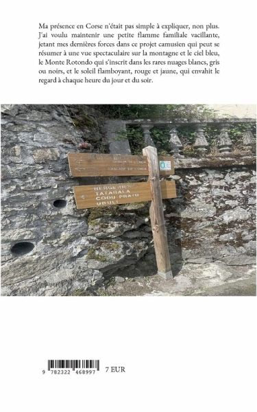 Ma présence en Corse n'était pas simple à expliquer, non plus. J'ai voulu maintenir une petite flamme familiale vacillante, jetant mes dernières forces dans ce projet camusien qui peut se résumer à une vue spectaculaire sur la montagne et le ciel bleu, le Monte Rotondo qui s'inscrit dans les rares nuages blancs, gris ou noirs, et le soleil flamboyant, rouge et jaune, qui envahit le regard à chaque heure du jour et du soir.