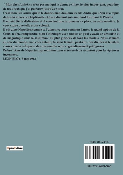 " Mon cher André, ce n¿est pas moi qui te donne ce livre, le plus impor- tant, peut-être, de tous ceux que j¿ai pu écrire jusqüà ce jour. C¿est mon fils André qui te le donne, mon douloureux fils André que Dieu m¿a repris dans son innocence baptismale et qui a dix-huit ans, au- jourd¿hui, dans le Paradis. Il en eût été le dédicataire et il convient que tu prennes sa place, en cette manière. Je veux croire que telle est sa volonté. Il eût aimé Napoléon comme tu l¿aimes, et votre commun Patron, le grand Apôtre de la Croix, te fera comprendre, si tu l¿interroges avec amour, ce qüil y avait de désirable et de magnifique dans la souffrance du plus glorieux de tous les mortels. Nous sommes au soir du monde, mon cher enfant ; tu seras témoin, peut-être, des divines et terribles choses que le vainqueur des rois semble avoir si grandiosement préfigurées. Puisse l'Ame de Napoléon agrandir ton c¿ur et te servir de réconfort pour les épreuves inconnues. LÉON BLOY. 5 mai 1912."
