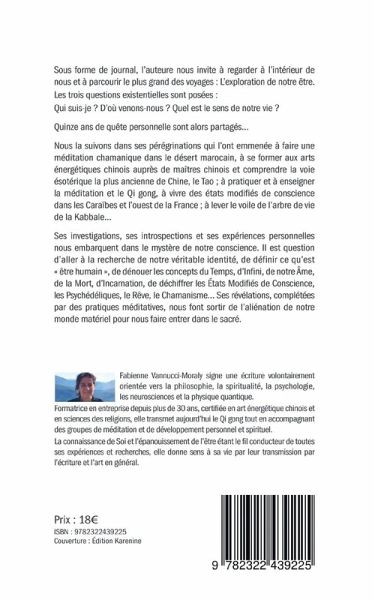 Sous forme de journal, l'auteure nous invite à regarder à l'intérieur de nous et à parcourir le plus grand des voyages : L'exploration de notre être. Les trois questions existentielles sont posées : Qui suis-je ? D'où venons-nous ? Quel est le sens de notre vie ? Quinze ans de quête personnelle sont alors partagés... Nous la suivons dans ses pérégrinations qui l'ont emmenée à faire une méditation chamanique dans le désert marocain, à se former aux arts énergétiques chinois auprès de maîtres chinois et comprendre la voie ésotérique la plus ancienne de Chine, la Tao ; à pratiquer et à enseigner la méditation et le QI gong, à vivre des états modifiés de conscience dans les Caraïbes et l'ouest de la France ; à lever le voile de l'arbre de la Kabbale... Ses investigations, ses introspections et ses expériences personnelles nous embarquent dans le mystère de notre conscience. Il est question d'aller à la recherche de notre véritable identité, de définir ce qu'est "être humain", de dénouer les concepts du Temps, d'Infini, de notre Âme, de la Mort, d'Incarnation, de déchiffrer les États Modifiés de Conscience, les Psychédéliques, le Rêve, le Chamanisme... Ses révélations, complétées par des pratiques méditatives, nous font sortir de l'aliénation de notre monde matériel pour nous faire entrer dans le monde sacré.