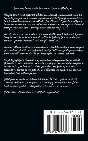 Découvrez l'Amour et la Guérison au C¿ur des Montagnes Plongez dans le récit captivant d'Alder, un séduisant solitaire ayant établi son havre de paix parmi les sommets majestueux d'Arelis Springs, consacrant son âme à la création de romans envoûtants. Son attachement pour les montagnes trouve ses racines dans une rencontre avec la mort dans son enfance, cherchant réconfort dans leur beauté sauvage et leur étreinte bienfaisante. Lors du mariage de son meilleur ami, le monde d'Alder est bouleversé à jamais lorsqu'il croise la route de la vive et captivante Bethany. Sans le savoir, leur rencontre fortuite ébranlera la solitude qu'il chérit tant. Lorsque Bethany se retrouve coincée dans un chalet de montagne après un pari qui a mal tourné, Alder est confronté à un défi inattendu : partager son refuge sacré avec cette citadine dont la résilience égale son charme captivant. Au fil de paysages à couper le souffle, leur lien se renforce à chaque instant. Des éclats de rire inattendus aux passions partagées, leur connexion s'enflamme au sein de la splendeur de la nature. Mais alors que Bethany lutte pour respecter les termes de son pari, elle doit affronter une décision qui pourrait bouleverser leur destin à jamais. Idéal pour les amateurs de héros intrépides, d'héroïnes pleines de vie et d'amours inattendues, lancez-vous dans un voyage inoubliable avec "L'Âme S¿ur du Montagnard" - votre prochaine lecture incontournable. Faites vôtre cette aventure irrésistible dès aujourd'hui !