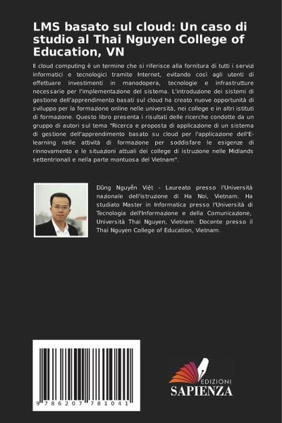 Il cloud computing è un termine che si riferisce alla fornitura di tutti i servizi informatici e tecnologici tramite Internet, evitando così agli utenti di effettuare investimenti in manodopera, tecnologie e infrastrutture necessarie per l'implementazione del sistema. L'introduzione dei sistemi di gestione dell'apprendimento basati sul cloud ha creato nuove opportunità di sviluppo per la formazione online nelle università, nei college e in altri istituti di formazione. Questo libro presenta i risultati delle ricerche condotte da un gruppo di autori sul tema "Ricerca e proposta di applicazione di un sistema di gestione dell'apprendimento basato su cloud per l'applicazione dell'E-learning nelle attività di formazione per soddisfare le esigenze di rinnovamento e le situazioni attuali dei college di istruzione nelle Midlands settentrionali e nella parte montuosa del Vietnam".