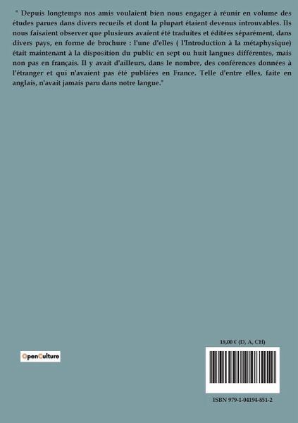 " Depuis longtemps nos amis voulaient bien nous engager à réunir en volume des études parues dans divers recueils et dont la plupart étaient devenus introuvables. Ils nous faisaient observer que plusieurs avaient été traduites et éditées séparément, dans divers pays, en forme de brochure : l'une d'elles ( l'Introduction à la métaphysique) était maintenant à la disposition du public en sept ou huit langues différentes, mais non pas en français. Il y avait d'ailleurs, dans le nombre, des conférences données à l'étranger et qui n'avaient pas été publiées en France. Telle d'entre elles, faite en anglais, n'avait jamais paru dans notre langue."
