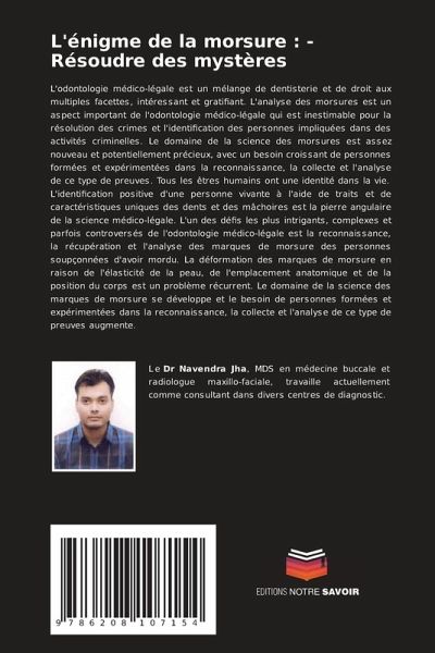 L'odontologie médico-légale est un mélange de dentisterie et de droit aux multiples facettes, intéressant et gratifiant. L'analyse des morsures est un aspect important de l'odontologie médico-légale qui est inestimable pour la résolution des crimes et l'identification des personnes impliquées dans des activités criminelles. Le domaine de la science des morsures est assez nouveau et potentiellement précieux, avec un besoin croissant de personnes formées et expérimentées dans la reconnaissance, la collecte et l'analyse de ce type de preuves. Tous les êtres humains ont une identité dans la vie. L'identification positive d'une personne vivante à l'aide de traits et de caractéristiques uniques des dents et des mâchoires est la pierre angulaire de la science médico-légale. L'un des défis les plus intrigants, complexes et parfois controversés de l'odontologie médico-légale est la reconnaissance, la récupération et l'analyse des marques de morsure des personnes soupçonnées d'avoir mordu. La déformation des marques de morsure en raison de l'élasticité de la peau, de l'emplacement anatomique et de la position du corps est un problème récurrent. Le domaine de la science des marques de morsure se développe et le besoin de personnes formées et expérimentées dans la reconnaissance, la collecte et l'analyse de ce type de preuves augmente.
