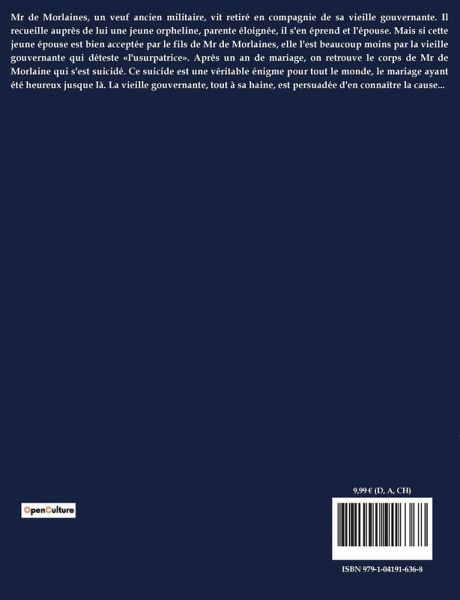 Mr de Morlaines, un veuf ancien militaire, vit retiré en compagnie de sa vieille gouvernante. Il recueille auprès de lui une jeune orpheline, parente éloignée, il s'en éprend et l'épouse. Mais si cette jeune épouse est bien acceptée par le fils de Mr de Morlaines, elle l'est beaucoup moins par la vieille gouvernante qui déteste «l'usurpatrice». Après un an de mariage, on retrouve le corps de Mr de Morlaine qui s'est suicidé. Ce suicide est une véritable énigme pour tout le monde, le mariage ayant été heureux jusque là. La vieille gouvernante, tout à sa haine, est persuadée d'en connaître la cause...