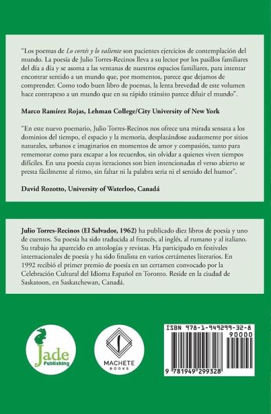 "Los poemas de Lo cortés y lo valiente son pacientes ejercicios de contemplación del mundo. La poesía de Julio Torres-Recinos lleva a su lector por los pasillos familiares del día a día y se asoma a las ventanas de nuestros espacios familiares, para intentar encontrar sentido a un mundo que, por momentos, parece que dejamos de comprender. Como todo buen libro de poemas, la lenta brevedad de este volumen hace contrapeso a un mundo que en su rápido tránsito parece diluir el mundo". Marco Ramírez Rojas, Lehman College/City University of New York "En este nuevo poemario, Julio Torres-Recinos nos ofrece una mirada sensata a los dominios del tiempo, el espacio y la memoria, desplazándose audazmente por sitios naturales, urbanos e imaginarios en momentos de amor y compasión, tanto para rememorar como para escapar a los recuerdos, sin olvidar a quienes viven tiempos difíciles. En una poesía cuyas iteraciones son bien intencionadas el verso abierto se presta fácilmente al ritmo, sin faltar ni la palabra seria ni el sentido del humor". David Rozotto, University of Waterloo, Canadá