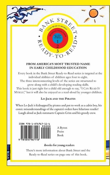 When Lo-Jack is kidnapped by pirates and put to work as a cabin boy, his comic misunderstandings of the captain's orders have hilarious results! Laugh aloud as Jack outsmarts Captain Grim and his greedy crew. FROM AMERICA'S MOST TRUSTED NAME IN EARLY CHILDHOOD EDUCATION More than seventy years of educational research and innovative teaching have given the Bank Street College of Education the reputation as America's most trusted name in early childhood education. Because no two children are exactly alike in their development, we have designed the Bank Street Ready-to-Read series in three levels to accommodate the individual stages of reading readiness of children ages four through eight. • Level 1: GETTING READY TO READ- (PRE-K to GRADE 1) Books are perfect for reading aloud with children who are getting ready to read or are just beginning to read words or phrases. • Level 2: READING TOGETHER-(GRADES 1 to 3) Books are written especiallly for children who are on their way to reading independently but who may need help. • Level 3: I CAN READ IT MYSELF-(GRADES 2 to 3) Books are designed for children able to read on their own. They also can be enjoyed as read-alouds.