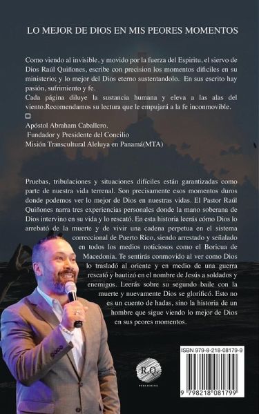 Pruebas, tribulaciones y situaciones difíciles están garantizadas como parte de nuestra vida terrenal. Son precisamente esos momentos duros donde podemos ver lo mejor de Dios en nuestras vidas. El Pastor Raúl Quiñones narra tres experiencias personales donde la mano soberana de Dios intervino en su vida y lo rescató. En esta historia leerás cómo Dios lo arrebató de la muerte y de vivir una cadena perpetua en el sistema correccional de Puerto Rico, siendo arrestado y señalado en todos los medios noticiosos como el Boricua de Macedonia. Te sentirás conmovido al ver como Dios lo trasladó al oriente y en medio de una guerra rescató y bautizó en el nombre de Jesús a soldados y enemigos. Leerás sobre su segundo baile con la muerte y nuevamente Dios se glorificó. Esto no es un cuento de hadas, sino la historia de un hombre que sigue viendo lo mejor de Dios en sus peores momentos.