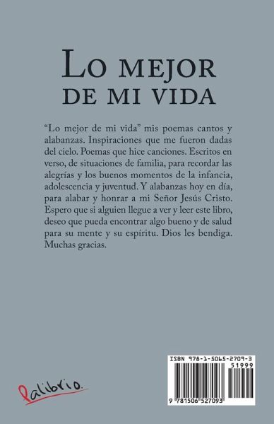 "Lo mejor de mi vida" mis poemas cantos y alabanzas. Inspiraciones que me fueron dadas del cielo. Poemas que hice canciones. Escritos en verso, de situaciones de familia, para recordar las alegrías y los buenos momentos de la infancia, adolescencia y juventud. Y alabanzas hoy en día, para alabar y honrar a mi Señor Jesús Cristo. Espero que si alguien llegue a ver y leer este libro, deseo que pueda encontrar algo bueno y de salud para su mente y su espíritu. Dios les bendiga. Muchas gracias.