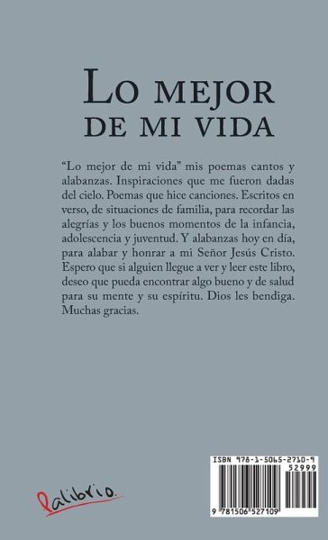 "Lo mejor de mi vida" mis poemas cantos y alabanzas. Inspiraciones que me fueron dadas del cielo. Poemas que hice canciones. Escritos en verso, de situaciones de familia, para recordar las alegrías y los buenos momentos de la infancia, adolescencia y juventud. Y alabanzas hoy en día, para alabar y honrar a mi Señor Jesús Cristo. Espero que si alguien llegue a ver y leer este libro, deseo que pueda encontrar algo bueno y de salud para su mente y su espíritu. Dios les bendiga. Muchas gracias.