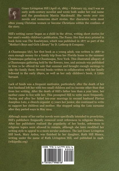 Grace Livingston Hill (April 16, 1865 – February 23, 1947) was an early 20th-century novelist and wrote both under her real name and the pseudonym Marcia Macdonald. She wrote over 100 novels and numerous short stories. Her characters were most often young Christian women or become Christians within the confines of the story. Hill's writing career began as a child in the 1870s, writing short stories for her aunt's weekly children's publication, The Pansy. Her first story printed in book form was The Esselstynes, which was published in 1877 as part of the "Mother's Boys and Girls Library" by D. Lothrop & Company. A Chautauqua Idyl, her first book as a young adult, was written in 1887 to earn enough money for a family trip from her Florida home to the summer Chautauqua gathering at Chautauqua, New York. This illustrated allegory of a Chautauqua gathering held by the flowers, tree, and animals was published in time to be offered for sale that summer and brought enough earnings to take the family there. Several books written in collaboration with her family followed in the early 1890s, as well as her only children's book, A Little Servant. Lack of funds was a frequent motivator, particularly after the death of her first husband left her with two small children and no income other than that from her writing. After the death of Hill's father less than a year later, her mother came to live with her. This prompted Hill to write more frequently. During and after her failed ten-year marriage to second husband Flavius Josephus Lutz, a church organist 15 years her junior, she continued to write to support her children and mother. She stopped using the Lutz surname after they parted ways in May 1914. Although many of her earlier novels were specifically intended to proselytize, Hill's publishers frequently removed overt references to religious themes. After her publishers realized the popularity of her books, references to religious topics were allowed to remain, although she later modified her writing style to appeal to a more secular audience. The last Grace Livingston Hill book, Mary Arden, was finished by her daughter, Ruth Hill Munce, writing under the name of Ruth Livingston Hill, and published in 1948. (wikipedia.org)