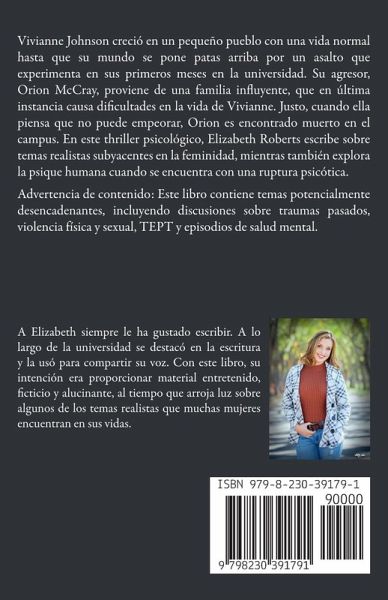 Vivianne Johnson creció en un pequeño pueblo con una vida normal hasta que su mundo se pone patas arriba por un asalto que experimenta en sus primeros meses en la universidad. Su agresor, Orion McCray, proviene de una familia influyente, que en última instancia causa dificultades en la vida de Vivianne. Justo, cuando ella piensa que no puede empeorar, Orion es encontrado muerto en el campus. En este thriller psicológico, Elizabeth Roberts escribe sobre temas realistas subyacentes en la feminidad, mientras también explora la psique humana cuando se encuentra con una ruptura psicótica. Advertencia de contenido: Este libro contiene temas potencialmente desencadenantes, incluyendo discusiones sobre traumas pasados, violencia física y sexual, TEPT y episodios de salud mental. A Elizabeth siempre le ha gustado escribir. A lo largo de la universidad se destacó en la escritura y la usó para compartir su voz. Con este libro, su intención era proporcionar material entretenido, ficticio y alucinante, al tiempo que arroja luz sobre algunos de los temas realistas que muchas mujeres encuentran en sus vidas. Ella está deseando escribir y publicar más libros, ¡y está emocionada de haberte traído este libro!