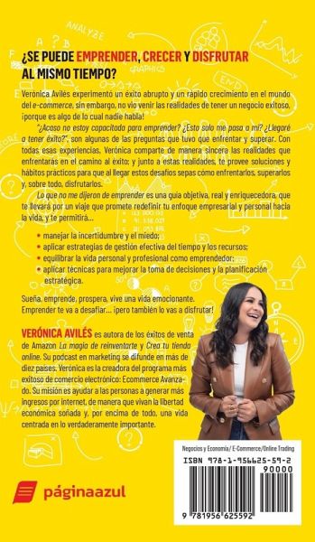¿Se puede emprender, crecer y disfrutar al mismo tiempo? Verónica Avilés experimentó un éxito abrupto y un rápido crecimiento en el mundo del e-commerce, sin embargo, no vio venir las realidades de tener un negocio exitoso, ¡porque es algo de lo cual nadie habla! "¿Acaso no estoy capacitada para emprender? ¿Esto solo me pasa a mí? ¿Llegaré a tener éxito?", son algunas de las preguntas que tuvo que enfrentar y superar. Con todas esas experiencias, Verónica comparte de manera sincera las realidades que enfrentarás en el camino al éxito; y junto a estas realidades, te provee soluciones y hábitos prácticos para que al llegar estos desafíos sepas cómo enfrentarlos, superarlos y, sobre todo, disfrutarlos. Lo que no me dijeron de emprender es una guía objetiva, real y enriquecedora, que te llevará por un viaje que promete redefinir tu enfoque empresarial y personal hacia la vida y te permitirá...manejar la incertidumbre y el miedo; aplicar estrategias de gestión efectiva del tiempo y los recursos; equilibrar la vida personal y profesional como emprendedor; aplicar técnicas para mejorar la toma de decisiones y la planificación estratégica. Sueña, emprende, prospera, vive una vida emocionante. Emprender te va a desafiar... ¡pero también lo vas a disfrutar!