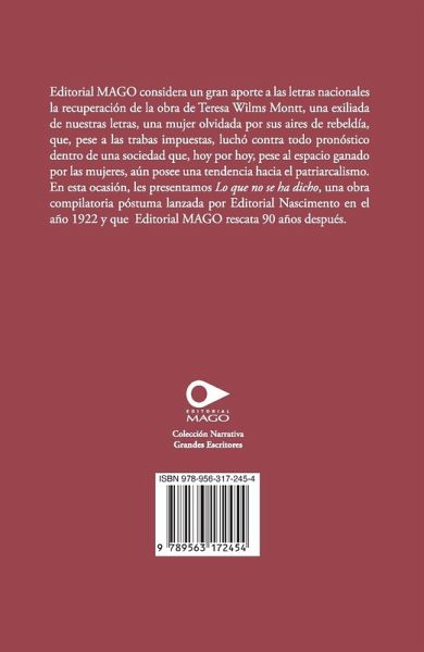 Editorial MAGO considera un gran aporte a las letras nacionales la recuperación de la desconocida obra de Teresa Wilms Montt, una exiliada de nuestras letras, una mujer olvidada por sus aires de rebeldía, que, pese a las trabas impuestas, luchó contra todo pronóstico dentro de una sociedad que, hoy por hoy, sigue teniendo un dominio absolutamente patriarcal. En esta ocasión, les presentamos Lo que no se ha dicho, una obra compilatoria póstuma lanzada por Editorial Nascimento en el año 1922 y que rescatamos 90 años después