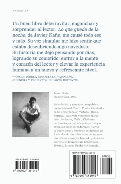 Dividida en cuatro capítulos con historias y personajes aparentemente desvinculados entre sí, esta novela presenta un panorama general de la sociedad salvadoreña y el proceso que ha seguido para recomponerse tras los diversos acontecimientos trágicos de su pasado reciente, tales como los terremotos de 1986 y 2001. La guerra civil de los años ochenta y noventa, la migración y el exilio posteriores, entre otros. No obstante, dichos sucesos son apenas el marco en el que se incrustan estos fragmentarios relatos, los cuales no aspiran a ofrecer una exhaustiva visión histórica o sociológica, sino una perspectiva íntima y personal de la manera en que esos eventos impactaron las vidas de la gente común y repercutieron en la transformación de su identidad. Para lograrlo, el autor explora la naturaleza humana de sus personajes, sus miedos y contradicciones, a través de temas como la maternidad subrogada, el abandono paterno, los matrimonios forzados, la corrupción y la dependencia económica de las remesas, además de echar mano de una narración con abruptos saltos en el tiempo que le permiten mantener el suspenso y lograr que la única constante sea la incertidumbre de saber cuál será el siguiente giro en la trama. Así, Javier Kafie crea una narrativa única por su combinación de emotividad y misterio, que atrapa la atención del lector desde los primeros momentos y lo motiva a continuar hasta el sorpresivo final, en el que todo el entramado de historias cobra un nuevo sentido. Reseña de "Lo que queda de la noche" Publisher's Weekly en Español (Año 3, Junio 2022)