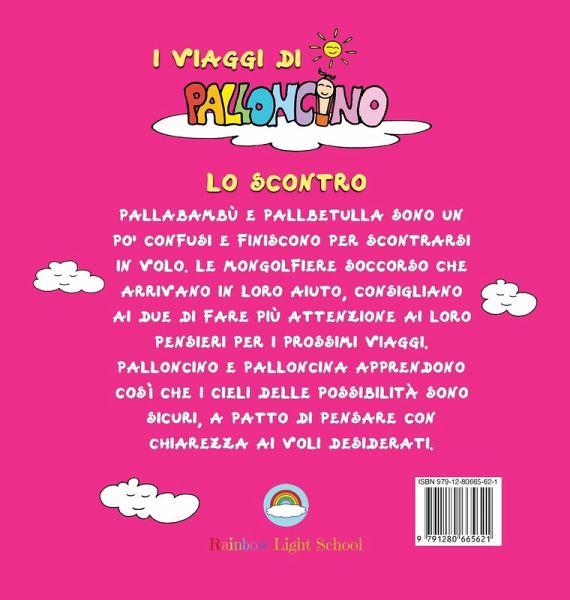 PALLABAMBÙ E PALLBETULLA SONO UN PO' CONFUSI E FINISCONO PER SCONTRARSI IN VOLO. LE MONGOLFIERE SOCCORSO CHE ARRIVANO IN LORO AIUTO, CONSIGLIANO AI DUE DI FARE PIÙ ATTENZIONE AI LORO PENSIERI PER I PROSSIMI VIAGGI. PALLONCINO E PALLONCINA APPRENDONO COSÌ CHE I CIELI DELLE POSSIBILITÀ SONO SICURI, A PATTO DI PENSARE CON CHIAREZZA AI VOLI DESIDERATI.