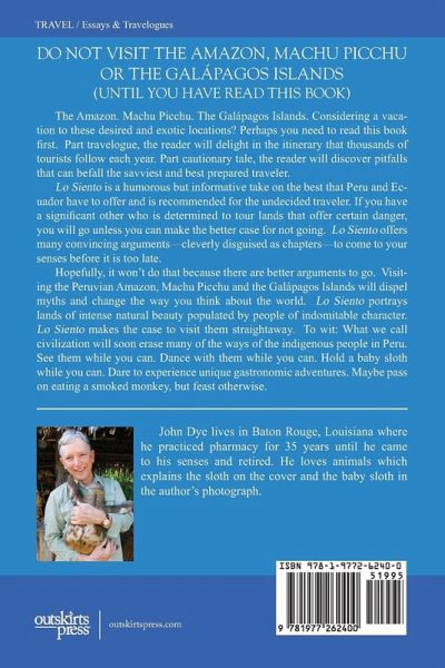 DO NOT VISIT THE AMAZON, MACHU PICCHU OR THE GALÁPAGOS ISLANDS (UNTIL YOU HAVE READ THIS BOOK) The Amazon. Machu Picchu. The Galápagos Islands. Considering a vacation to these desired and exotic locations? Perhaps you need to read this book first. Part travelogue, the reader will delight in the itinerary that thousands of tourists follow each year. Part cautionary tale, the reader will discover pitfalls that can befall the savviest and best prepared traveler. Lo Siento is a humorous but informative take on the best that Peru and Ecuador have to offer and is recommended for the undecided traveler. If you have a significant other who is determined to tour lands that offer certain danger, you will go unless you can make the better case for not going. Lo Siento offers many convincing arguments-cleverly disguised as chapters-to come to your senses before it is too late. Hopefully, it won't do that because there are better arguments to go. Visiting the Peruvian Amazon, Machu Picchu and the Galápagos Islands will dispel myths and change the way you think about the world. Lo Siento portrays lands of intense natural beauty populated by people of indomitable character. Lo Siento makes the case to visit them straightaway. To wit: What we call civilization will soon erase many of the ways of the indigenous people in Peru. See them while you can. Dance with them while you can. Hold a baby sloth while you can. Dare to experience unique gastronomic adventures. Maybe pass on eating a smoked monkey, but feast otherwise.