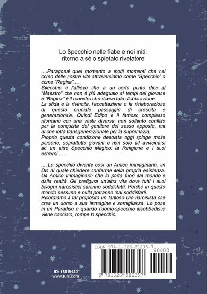 ....Paragonai quel momento a molti momenti che nel corso delle nostre vite attraversiamo come "Specchio" o come "Regina".... Specchio è l'allievo che a un certo punto dice al "Maestro" che non è più adeguato ai tempi del giovane e "Regina" è il maestro che riceve tale dichiarazione. La sfida e la rivincita, l'accettazione o la rielaborazione di questo cruciale passaggio di crescita e generazionale. Quindi Edipo e il famoso complesso ritornano con una veste diversa: non soltanto conflitto per la conquista del genitore del sesso opposto, ma anche lotta transgenerazionale per la supremazia. Proprio questa condizione desolata oggi spinge molte persone, soprattutto giovani e non solo ad avvicinarsi ad un altro Specchio Magico: la Religione e i suoi estremi.... la Religione e i suoi estremi. Lo Specchio Magico gli dice che lui è il più bello e se farà quello che lo specchio gli dirà sarà premiato.....