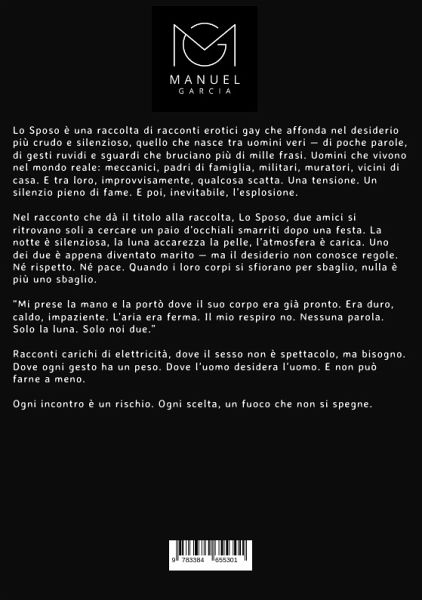 Lo Sposo è una raccolta di racconti erotici gay che affonda nel desiderio più crudo e silenzioso, quello che nasce tra uomini veri - di poche parole, di gesti ruvidi e sguardi che bruciano più di mille frasi. Uomini che vivono nel mondo reale: meccanici, padri di famiglia, militari, muratori, vicini di casa. E tra loro, improvvisamente, qualcosa scatta. Una tensione. Un silenzio pieno di fame. E poi, inevitabile, l'esplosione.Nel racconto che dà il titolo alla raccolta, Lo Sposo, due amici si ritrovano soli a cercare un paio d'occhiali smarriti dopo una festa. La notte è silenziosa, la luna accarezza la pelle, l'atmosfera è carica. Uno dei due è appena diventato marito - ma il desiderio non conosce regole. Né rispetto. Né pace. Quando i loro corpi si sfiorano per sbaglio, nulla è più uno sbaglio."Mi prese la mano e la portò dove il suo corpo era già pronto. Era duro, caldo, impaziente. L'aria era ferma. Il mio respiro no. Nessuna parola. Solo la luna. Solo noi due."Racconti carichi di elettricità, dove il sesso non è spettacolo, ma bisogno. Dove ogni gesto ha un peso. Dove l'uomo desidera l'uomo. E non può farne a meno.Ogni incontro è un rischio. Ogni scelta, un fuoco che non si spegne.
