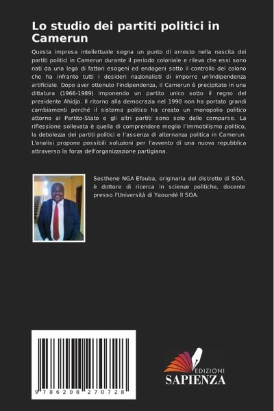 Questa impresa intellettuale segna un punto di arresto nella nascita dei partiti politici in Camerun durante il periodo coloniale e rileva che essi sono nati da una lega di fattori esogeni ed endogeni sotto il controllo del colono che ha infranto tutti i desideri nazionalisti di imporre un'indipendenza artificiale. Dopo aver ottenuto l'indipendenza, il Camerun è precipitato in una dittatura (1966-1989) imponendo un partito unico sotto il regno del presidente Ahidjo. Il ritorno alla democrazia nel 1990 non ha portato grandi cambiamenti perché il sistema politico ha creato un monopolio politico attorno al Partito-Stato e gli altri partiti sono solo delle comparse. La riflessione sollevata è quella di comprendere meglio l¿immobilismo politico, la debolezza dei partiti politici e l¿assenza di alternanza politica in Camerun. L'analisi propone possibili soluzioni per l'avvento di una nuova repubblica attraverso la forza dell'organizzazione partigiana.