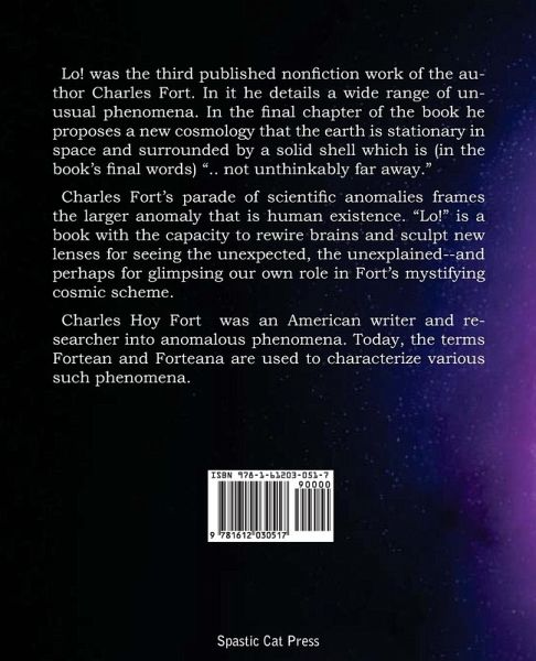 Lo! was the third published nonfiction work of the author Charles Fort. In it he details a wide range of unusual phenomena. In the final chapter of the book he proposes a new cosmology that the earth is stationary in space and surrounded by a solid shell which is (in the book's final words) ".. not unthinkably far away." Charles Fort's parade of scientific anomalies frames the larger anomaly that is human existence. "Lo!" is a book with the capacity to rewire brains and sculpt new lenses for seeing the unexpected, the unexplained--and perhaps for glimpsing our own role in Fort's mystifying cosmic scheme. Charles Hoy Fort was an American writer and researcher into anomalous phenomena. Today, the terms Fortean and Forteana are used to characterize various such phenomena.