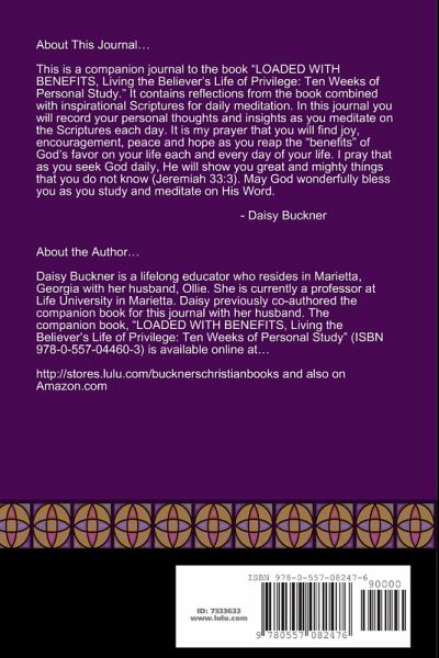 This is a companion journal to the book "LOADED WITH BENEFITS, Living the Believer's Life of Privilege: Ten Weeks of Personal Study" (ISBN 978-0-557-04460-3). It contains reflections from the book combined with inspirational Scriptures for daily meditation. In this journal you will record your personal thoughts and insights as you meditate on the Scriptures each day, finding joy, peace and hope, as you reap the "benefits" of God's favor on your life. You will be encouraged daily as God shows you great and mighty things from His Word.