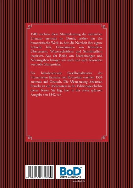 1508 erschien diese Meisterleistung der satirischen Literatur erstmals im Druck, seither hat das humanistische Werk, in dem die Narrheit ihre eigene Lobrede hält, Generationen von Künstlern, Übersetzern, Wissenschaftlern und Schriftstellern inspiriert. Aus der Reihe von Bearbeitungen und Neuausgaben bringen wir nach und nach besonders wertvolle Glanzstücke.Die bahnbrechende Gesellschaftssatire des Humanisten Erasmus von Rotterdam erschien 1534 erstmals auf Deutsch. Die Übersetzung Sebastian Francks ist ein Meilenstein in der Editionsgeschichte dieses Textes. Sie liegt hier in der etwas späteren Ausgabe von 1542 vor.