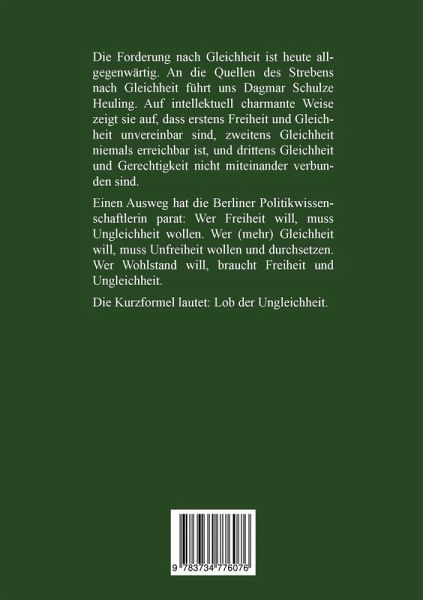 Die Forderung nach Gleichheit ist heute allgegenwärtig. An die Quellen des Strebens nach Gleichheit führt uns Dagmar Schulze Heuling. Auf intellektuell charmante Weise zeigt sie auf, dass erstens Freiheit und Gleichheit unvereinbar sind, zweitens Gleichheit niemals erreichbar ist, und drittens Gleichheit und Gerechtigkeit nicht miteinander verbunden sind. Einen Ausweg hat die Berliner Politikwissenschaftlerin parat: Wer Freiheit will, muss Ungleichheit wollen. Wer (mehr) Gleichheit will, muss Unfreiheit wollen und durchsetzen. Wer Wohlstand will, braucht Freiheit und Ungleichheit. Die Kurzformel lautet: Lob der Ungleichheit.