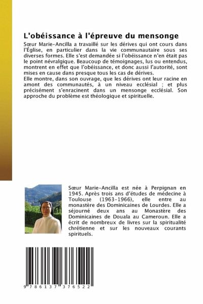 Soeur Marie-Ancilla a travaillé sur les dérives qui ont cours dans l'Église, en particulier dans la vie communautaire sous ses diverses formes. Elle s'est demandée si l'obéissance n'en était pas le point névralgique. Beaucoup de témoignages, lus ou entendus, montrent en effet que l'obéissance, et donc aussi l'autorité, sont mises en cause dans presque tous les cas de dérives.Elle montre, dans son ouvrage, que les dérives ont leur racine en amont des communautés, à un niveau ecclésial ; et plus précisément s'enracinent dans un mensonge ecclésial. Son approche du problème est théologique et spirituelle.