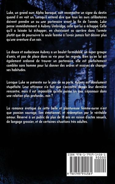 Luke, un grand ours Alpha baraqué, sait reconnaître un signe du destin quand il en voit un. Lorsqu'il entend dire que tous les ours célibataires doivent prendre un ou une partenaire avant la fin de l'année, Luke pense immédiatement à Aubrey Umbridge, celle qui lui a échappé. Celle qu'il a laissée lui échapper, en choisissant sa carrière dans l'armée plutôt que de poursuivre la seule femme à l'avoir jamais fait désirer plus qu'une aventure d'un soir. La douce et audacieuse Aubrey a un boulot formidable, un super groupe d'amis, et pas de place dans sa vie pour les regrets. Bien qu'on lui ait également ordonné de trouver un partenaire, elle est parfaitement comblée sans homme pour lui donner des ordres et essayer de changer ses habitudes. Lorsque Luke se présente sur le pas de sa porte, Aubrey est absolument stupéfaite. Leur attirance n'a fait que s'accroître depuis leur dernière rencontre, mais il est impossible qu'elle puisse un jour s'épanouir dans une relation plus profonde... non ? La romance érotique de cette belle et plantureuse femme-ourse n'est que passion sauvage, lien émotionnel, et rédemption par le véritable amour. Réservé à un public de plus de 18 ans en raison d'actes sexuels, de langage grossier, et de certaines situations très adultes.