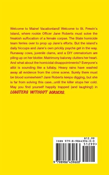 Welcome to Maine! Vacationland! Welcome to St. Frewin's Island, where rookie Officer Jane Roberts must solve the freakish suffocation of a female corpse. The State homicide team ferries over to prop up Jane's efforts. But the island's daily hiccups and Jane's own prickly psyche get in the way. Runaway cows, juvenile clams, and a DIY crematorium are piling up on her blotter. Matrimony baloney clutters her heart. And what about the homicidal disappointments? Everyone's alibi is sounding like a lullaby. Heavy rains have washed away all evidence from the crime scene. Surely there must be blood somewhere? Jane Roberts keeps digging, but she is far from cracking this case...until the killer stops her cold. May you find yourself happily trapped (and laughing!) in LOBSTERS WITHOUT BORDERS.