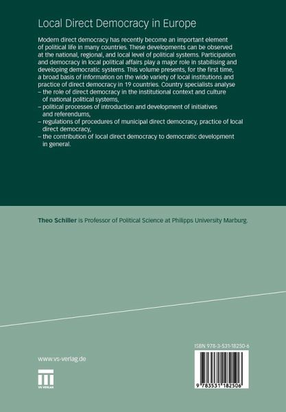 Modern direct democracy has recently become an important element of political life in many countries. These developments can be observed at the national, regional, and local level of political systems. Participation and democracy in local political affairs play a major role in stabilising and developing democratic systems. This volume presents, for the first time, a broad basis of information on the wide variety of local institutions and practice of direct democracy in 19 countries. Country specialists analyse
