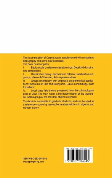 The goal of this book is to present local class field theory from the cohomo logical point of view, following the method inaugurated by Hochschild and developed by Artin-Tate. This theory is about extensions-primarily abelian-of "local" (i.e., complete for a discrete valuation) fields with finite residue field. For example, such fields are obtained by completing an algebraic number field; that is one of the aspects of "localisation". The chapters are grouped in "parts". There are three preliminary parts: the first two on the general theory of local fields, the third on group coho mology. Local class field theory, strictly speaking, does not appear until the fourth part. Here is a more precise outline of the contents of these four parts: The first contains basic definitions and results on discrete valuation rings, Dedekind domains (which are their "globalisation") and the completion process. The prerequisite for this part is a knowledge of elementary notions of algebra and topology, which may be found for instance in Bourbaki. The second part is concerned with ramification phenomena (different, discriminant, ramification groups, Artin representation). Just as in the first part, no assumptions are made here about the residue fields. It is in this setting that the "norm" map is studied; I have expressed the results in terms of "additive polynomials" and of "multiplicative polynomials", since using the language of algebraic geometry would have led me too far astray.