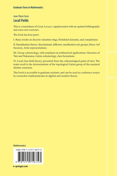 The goal of this book is to present local class field theory from the cohomo logical point of view, following the method inaugurated by Hochschild and developed by Artin-Tate. This theory is about extensions-primarily abelian-of "local" (i.e., complete for a discrete valuation) fields with finite residue field. For example, such fields are obtained by completing an algebraic number field; that is one of the aspects of "localisation". The chapters are grouped in "parts". There are three preliminary parts: the first two on the general theory of local fields, the third on group coho mology. Local class field theory, strictly speaking, does not appear until the fourth part. Here is a more precise outline of the contents of these four parts: The first contains basic definitions and results on discrete valuation rings, Dedekind domains (which are their "globalisation") and the completion process. The prerequisite for this part is a knowledge of elementary notions of algebra and topology, which may be found for instance in Bourbaki. The second part is concerned with ramification phenomena (different, discriminant, ramification groups, Artin representation). Just as in the first part, no assumptions are made here about the residue fields. It is in this setting that the "norm" map is studied; I have expressed the results in terms of "additive polynomials" and of "multiplicative polynomials", since using the language of algebraic geometry would have led me too far astray.