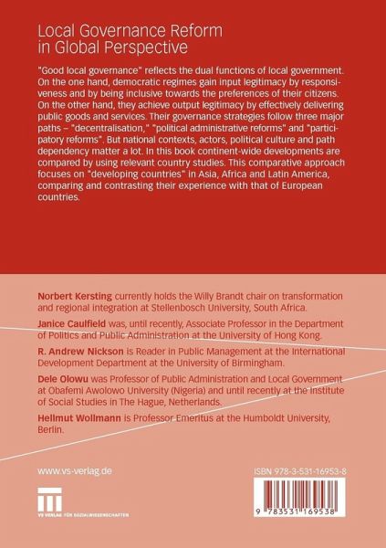 "Good local governance" reflects the dual functions of local government. On the one hand, democratic regimes gain input legitimacy by responsiveness and by being inclusive towards the preferences of their citizens. On the other hand, they achieve output legitimacy by effectively delivering public goods and services. Their governance strategies follow three major paths - "decentralisation," "political administrative reforms" and "participatory reforms". But national contexts, actors, political culture and path dependency matter a lot. In this book continent-wide developments are compared by using relevant country studies. This comparative approach focuses on "developing countries" in Asia, Africa and Latin America, comparing and contrasting their experience with that of European countries