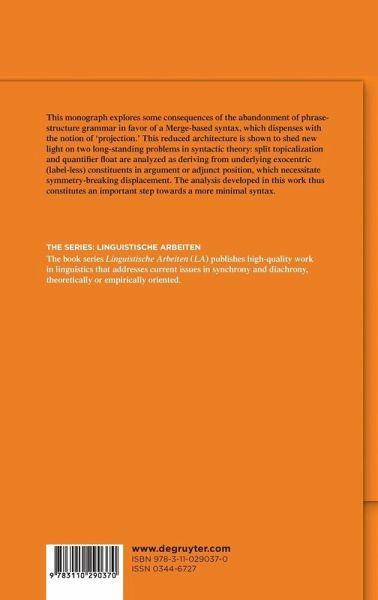 This monograph argues for a novel approach to split topicalization and quantifier float in German, based on the premise that syntactic structure-building proceeds solely via free application of Merge. Following recent developments in the pursuit of a more principled theory of syntax, it is argued that the stipulative notion of â??projectionâ?? ought to be dispensed with: syntactic objects created by Merge are not headed, and endocentricity arises due to a simple search algorithm. When this algorithm fails, specifically in symmetric {XP,YP} structures, an unlabeled constituent results; where a label is required, such structures are locally unstable. It is argued that both split topics and floated quantifiers are the result of this kind of local instability: when an exocentric predication structure is merged in argument or adjunct position, XP must be displaced at the phase level to allow for determination of a label. It is this symmetry-breaking movement that yields the â??split constituentâ?? in surface form. Based on careful empirical scrutiny of two recalcitrant problems for syntactic theory, the present work adduces substantial support for a â??minimalistâ?? grammatical architecture devoid of phrase-structural residue.