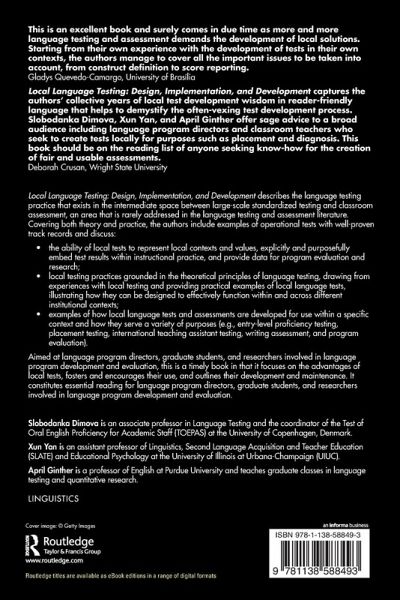Local Language Testing: Design, Implementation, and Development describes the language testing practice that exists in the intermediate space between large-scale standardized testing and classroom assessment, an area that is rarely addressed in the language testing and assessment literature. Covering both theory and practice, the book focuses on the advantages of local tests, fosters and encourages their use, and provides suggested ideas for their development and maintenance. The authors include examples of operational tests with well-proven track records and discuss: the ability of local tests to represent local contexts and values, explicitly and purposefully embed test results within instructional practice, and provide data for program evaluation and researchlocal testing practices grounded in the theoretical principles of language testing, drawing from experiences with local testing and providing practical examples of local language tests, illustrating how they can be designed to effectively function within and across different institutional contextsexamples of how local language tests and assessments are developed for use within a specific context and how they serve a variety of purposes (e.g., entry-level proficiency testing, placement testing, international teaching assistant testing, writing assessment, and program evaluation) Aimed at language program directors, graduate students, and researchers involved in language program development and evaluation, this is a timely book in that it focuses on the advantages of local tests, fosters and encourages their use, and outlines their development and maintenance. It constitutes essential reading for language program directors, graduate students, and researchers involved in language program development and evaluation.