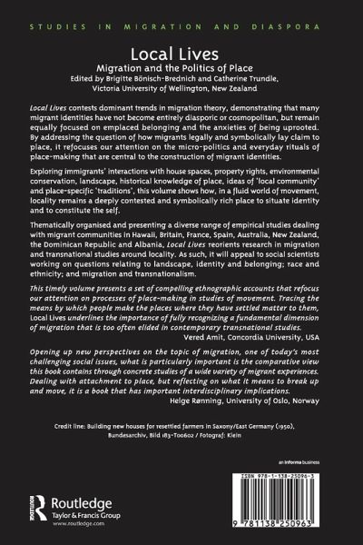 Local Lives contests dominant trends in migration theory, demonstrating that many migrant identities have not become entirely diasporic or cosmopolitan, but remain equally focused on emplaced belonging and the anxieties of being uprooted. By addressing the question of how migrants legally and symbolically lay claim to owning and belonging to place, it refocuses our attention on the micro-politics and everyday rituals of place-making, that are central to the construction of migrant identities. Exploring immigrants' interactions with house spaces, property rights, environmental conservation, landscape, historical knowledge of place, ideas of 'local community' and place-specific 'traditions', this volume shows how, in a fluid world of movement, locality remains a deeply contested and symbolically rich place to situate identity and to constitute the self. Thematically organised and presenting a diverse range of empirical studies dealing with migrant communities in Hawaii, Britain, France, Spain, Australia, New Zealand, the Dominican Republic and Albania, Local Lives reorients research in migration and transnational studies around locality. As such, it will appeal to social scientists working on questions relating to landscape, identity and belonging; race and ethnicity; and migration and transnationalism.