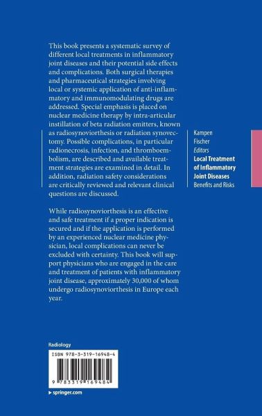 This book presents a systematic survey of different local treatments in inflammatory joint diseases and their potential side effects and complications. Both surgical therapies and pharmaceutical strategies involving local or systemic application of anti-inflammatory and immunomodulating drugs are addressed. Special emphasis is placed on nuclear medicine therapy by intra-articular instillation of beta radiation emitters, known as radiosynoviorthesis or radiation synovectomy. Possible complications, in particular radionecrosis, infection, and thromboembolism, are described and available treatment strategies are examined in detail. In addition, radiation safety considerations are critically reviewed and relevant clinical questions are discussed.