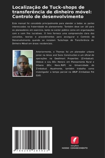 Este manual foi concebido principalmente para atender a todas as partes interessadas na fraternidade do planeamento. Também deve ser útil para os planeadores em exercício, tanto no sector público como em organizações com e sem fins lucrativos. O livro fornece uma compreensão clara dos conceitos, teorias e procedimentos para assegurar o Controlo do Desenvolvimento quando se instalam Tuckshops de Transferência de Dinheiro Móvel em áreas residenciais.