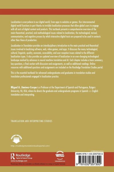 Miguel Jiménez-Crespo has already established himself as the go-to expert for web localization, but with this new book, he offers insights into localization on a broader scale, taking in not only the web but also software, video games and apps. What's more, he does not shy away from exploring the complex relationships between localization and pressing issues such as accessibility, sustainability, and generative large language models (LLMs). No other resource offers such a comprehensive and up-to-date investigation of the theory and practice of localization in all its forms, making this a must-read for translation students or professionals seeking to add localization work to their repertoire. - Lynne Bowker, University of Ottawa, Canada
